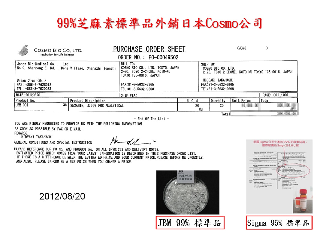 賀! 喬本生醫99%芝麻素結晶 2012年8月20正式進入日本芝麻素標準品市場