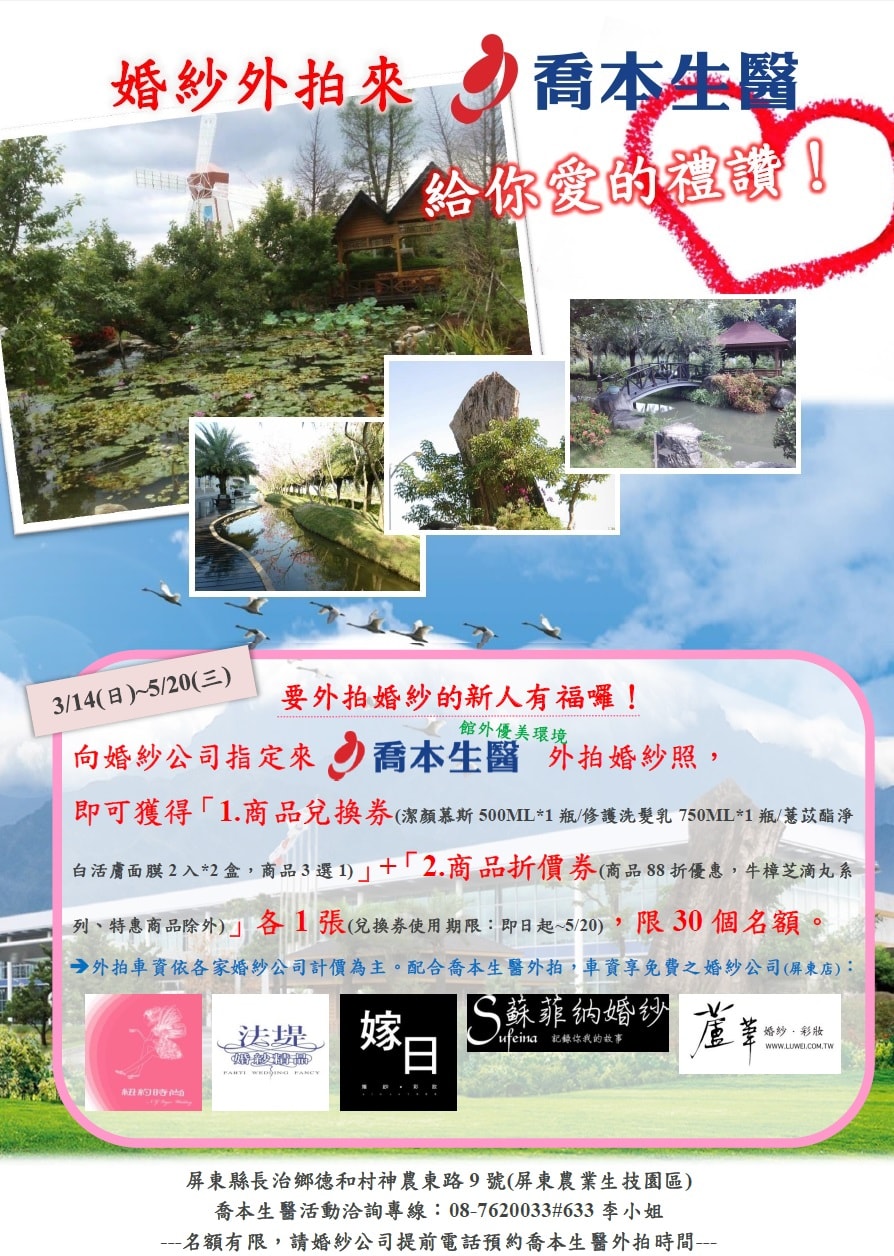 喬本生醫結合屏東五大婚紗公司舉辦婚紗外拍送好禮活動!向婚紗公司指定到喬本生醫外拍婚紗照,喬本生醫即貼心贈送結婚必備醫美香氛產品及商品折價券。除婚紗拍攝,向婚紗公司指定全家福或結婚週年到喬本外拍也可適用,限額30組,活動至5/20止。