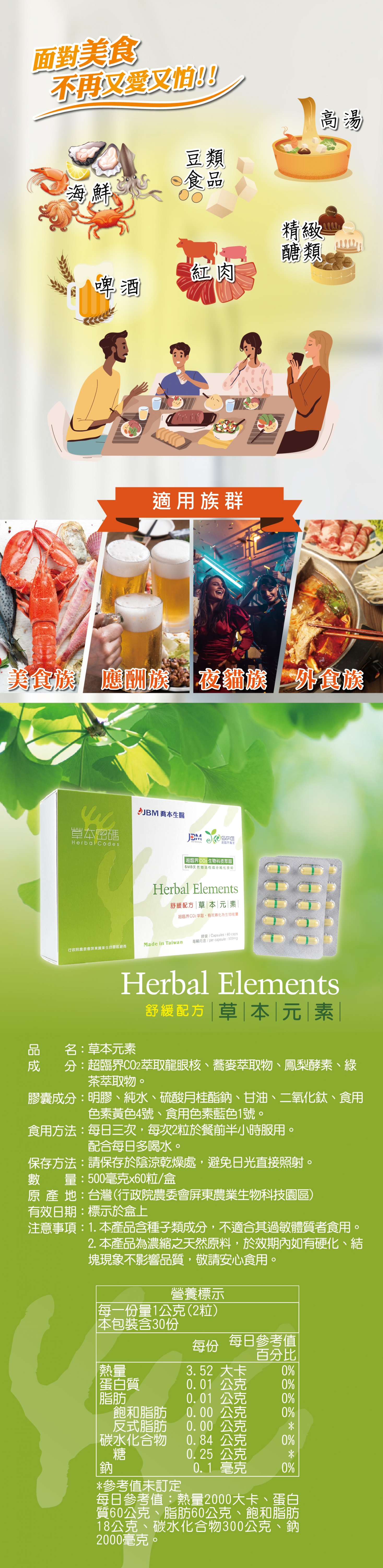 品 名:草本元素 成 分:超臨界CO2萃取龍眼核、蕎麥萃取物、鳳梨酵素、綠茶抽出物等天然草本植物元素。 包裝容量:500mg*60顆/盒 產 地:台灣 有效日期:標示於盒上 有效期限:三年 注意事項:本產品為濃縮之天然原料,於效期內如有硬化、結塊現象不影響品質,敬請安心食用。 保存方法:請保存於陰涼乾燥處,避免日光直射照射。 國際條碼:4715838171346